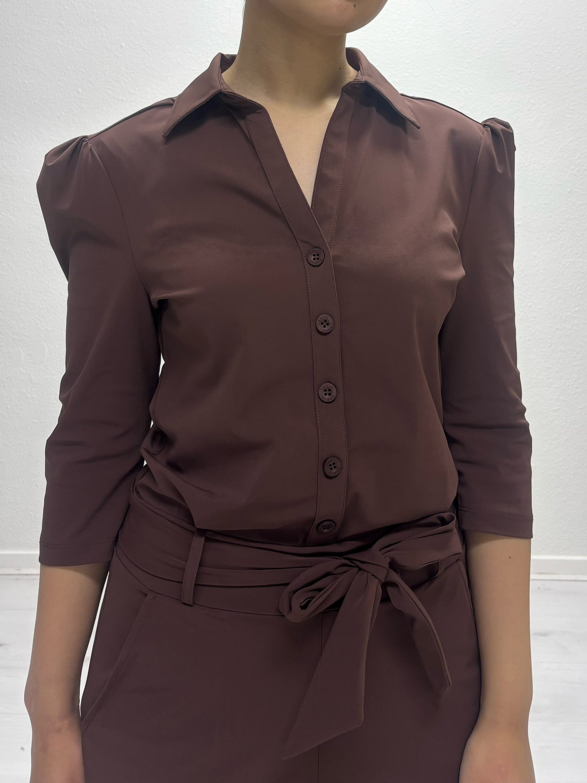 Ontdek de Daelin Elsa Travelstof Jumpsuit, de jumpsuit in de kleur bruin is een elegante en comfortabele travelstof jumpsuit met een afneembare strikceintuur. De jumpsuit heeft riemlussen, zodat je er ook je eigen riem door kunt dragen voor een persoonlijke touch. De V-hals met kraag, driekwart mouwen en subtiele pofmouwen op de schouders geven het pak een stijlvolle en vrouwelijke uitstraling. Dankzij de praktische zakken en soepele travelstof is dit een ideale keuze voor elke gelegenheid.