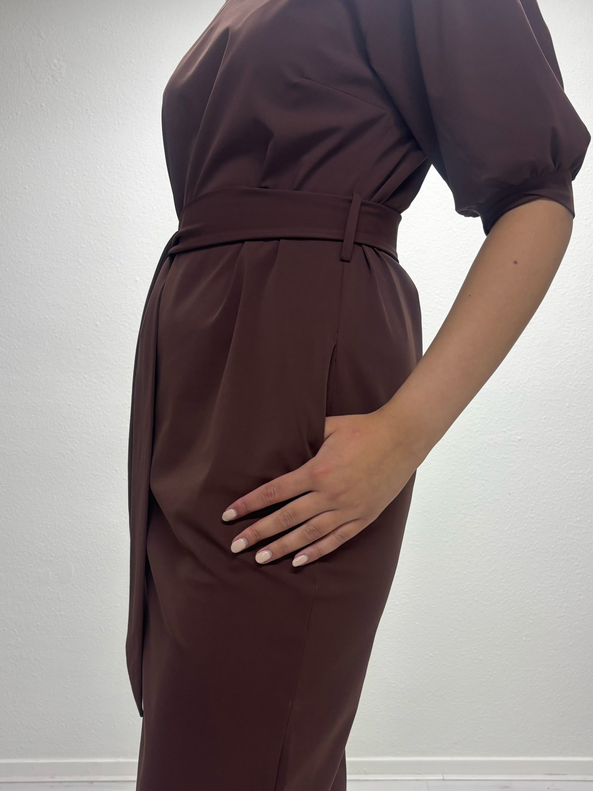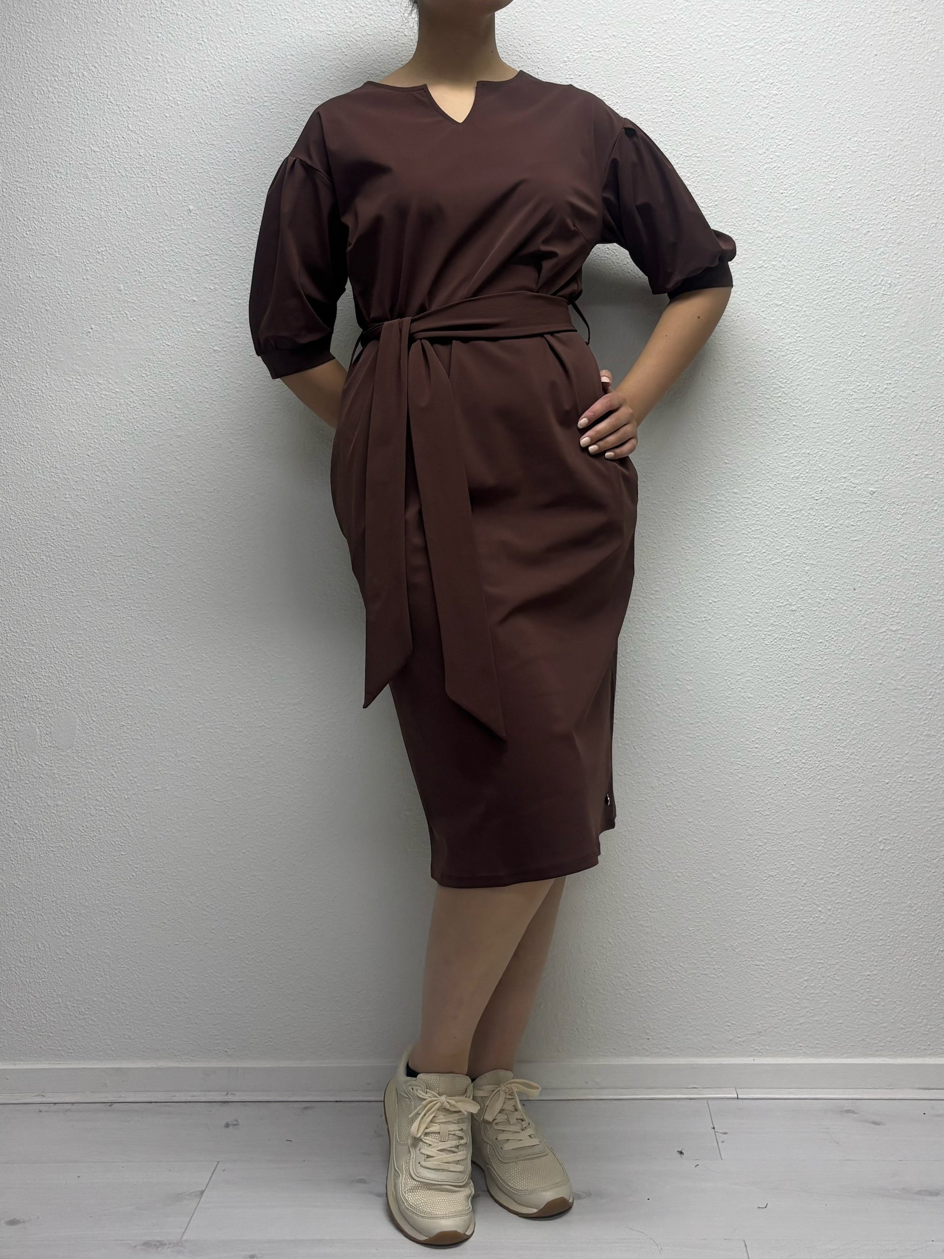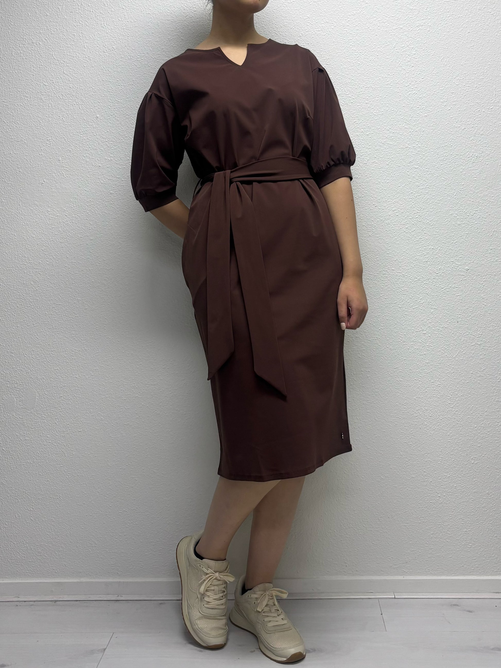 Ontdek de Daelin Edith Travelstof Jurk, een elegante en comfortabele jurk in de kleur Brown. Deze travelstof jurk valt net onder de knie en heeft een stijlvolle V-split hals met mouwen tot aan de elleboog. In de taille zitten riemlussen met een strikceintuur, waarmee je de pasvorm mooi kunt tailleren. De jurk is voorzien van praktische zakken, wat zorgt voor extra comfort en gebruiksgemak. De combinatie van de vrouwelijke snit, het soepele materiaal en het tijdloze design maakt deze jurk perfect voor zowel zakelijke als casual gelegenheden.