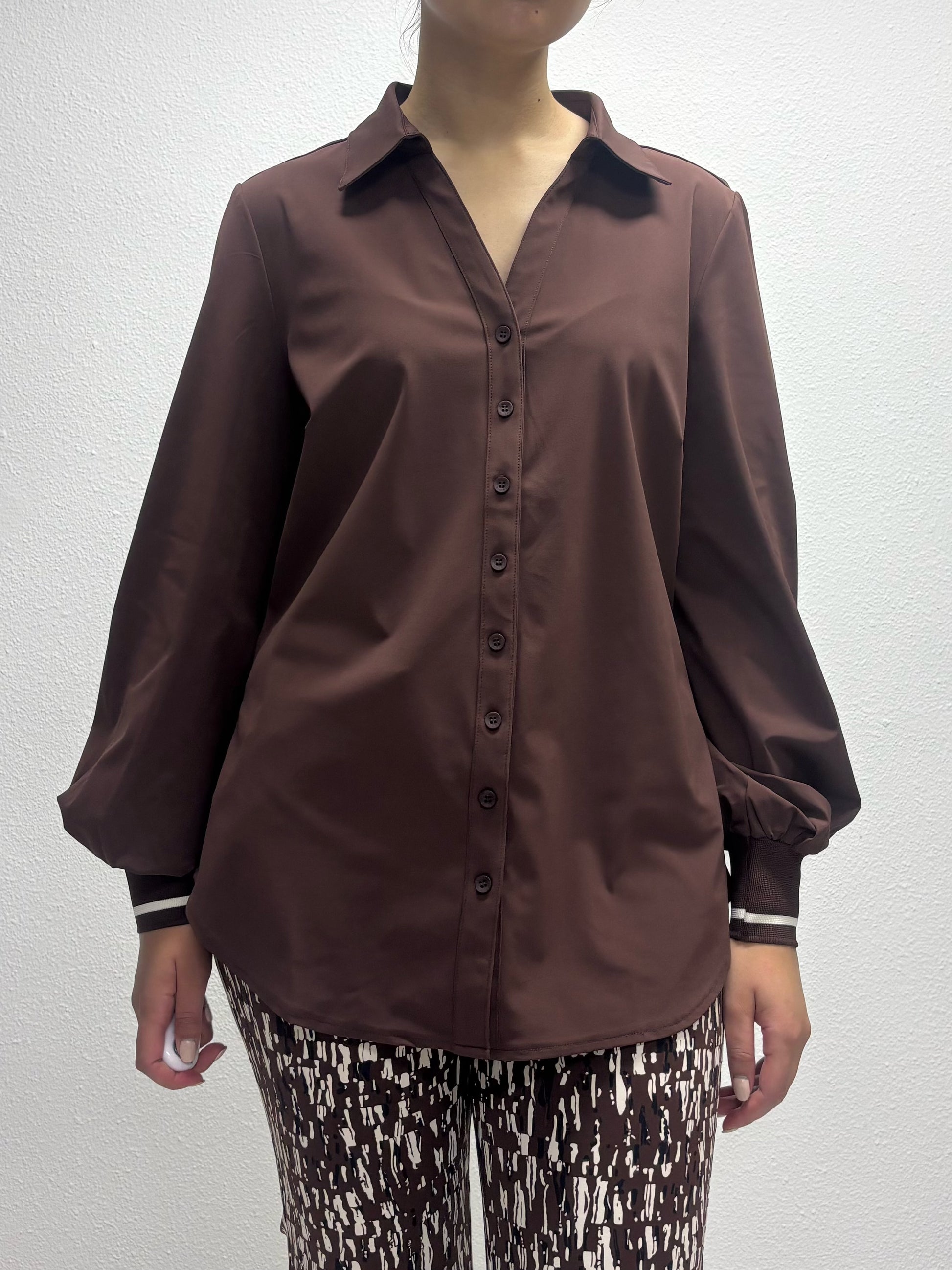 De blouse is verkrijgbaar in twee kleuren: bruin en wit.